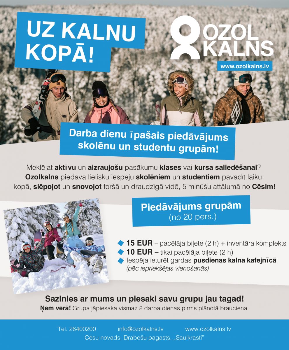 Ищете активное и захватывающее мероприятие, чтобы сплотить свой класс или группу? Озолкалнс предлагает прекрасную возможность для студентов провести время вместе, наслаждаясь катанием на лыжах и сноуборде в прохладной, дружелюбной и безопасной обстановке — всего в 5 минутах от Цесиса.